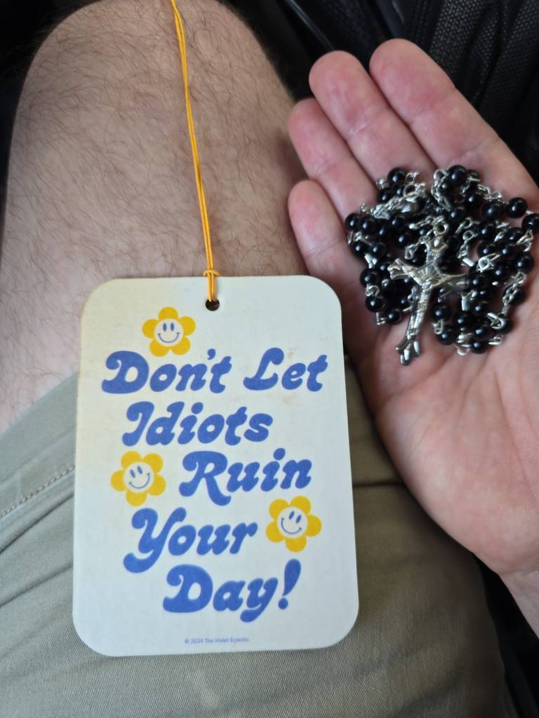 So, we ended up getting out and hugging and she told me that her brother committed suicide and so she just spreads love basically where she can. It was just an incredible, impactful moment that I will never forget. Then, she asked me if I believed in God. I told her “No, but I can appreciate people who do.” She told me a little bit about what was going on in her life and her family and how she had prayed and something wonderful happened. I don’t want to spread all of her business on here, but she ended up asking if she could give me the rosary that she would pray with and that she believes it’ll protect me. She also gave me this little smelly good thing for my car, I’m attaching a photo: